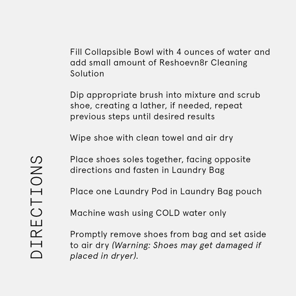 Srdcem tohoto kitu je 100% přírodní čisticí roztok Reshoevn8r o objemu 120 ml (4 oz.), který je vyvinut tak, aby byl šetrný k životnímu prostředí a zároveň bezpečný pro všechny materiály obuvi, včetně kůže, semiše, nubuku, plátna, síťoviny a syntetiky. Jeho pH-neutrální složení efektivně odstraňuje nečistoty bez poškození.